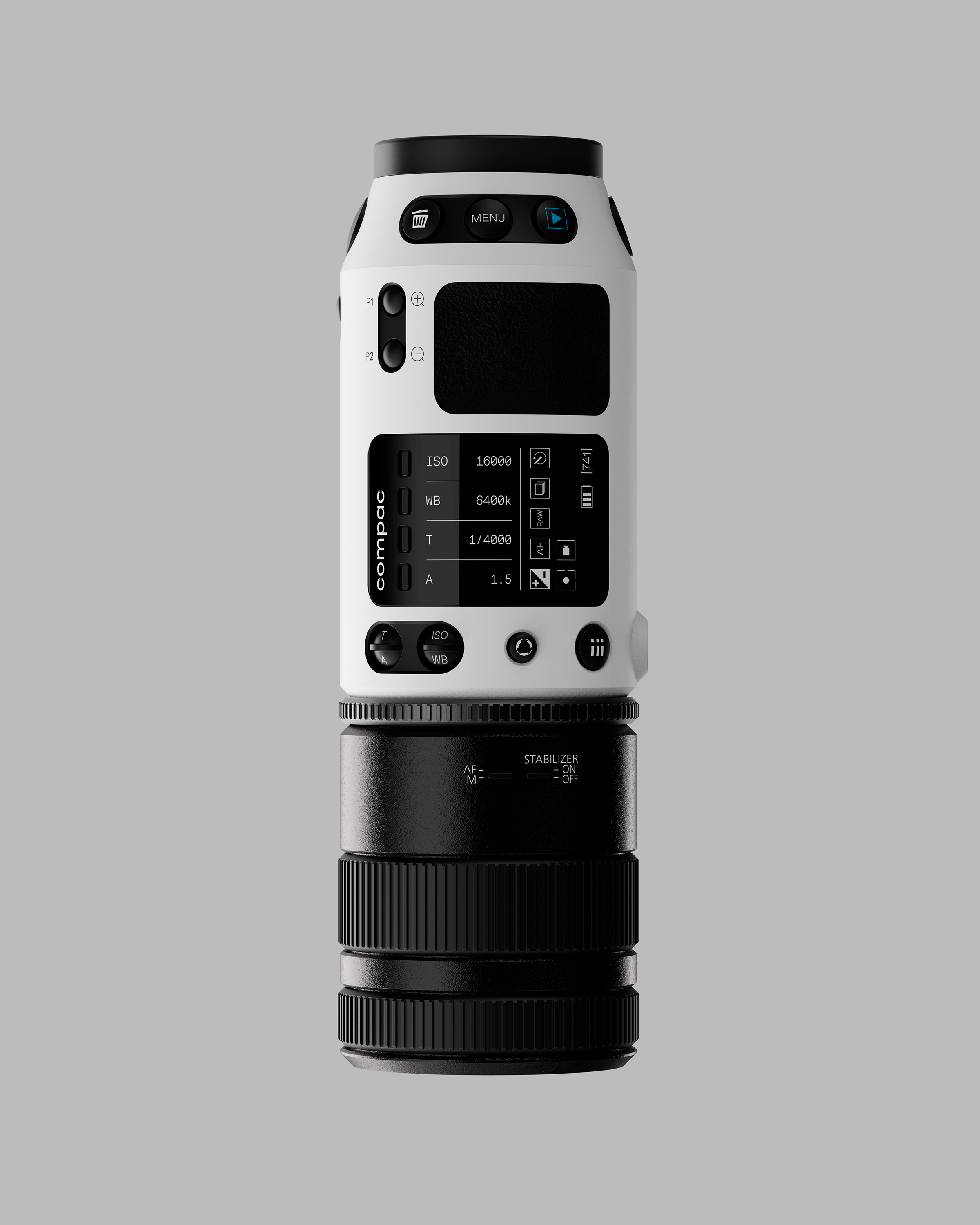 Eine kompakte Systemkamera mit taktiler und intuitiver Bedienung fürs manuelle Fotografieren. Grundlegend wird der bisherige Aufbau von Spiegelreflex- und Kompaktkameras hinterfragt. Der übliche Rechteckige Grundkörper, der früher Platz für die Film- und Aufnahmespule bot, wird aufgrund digitaler Sensoren nicht mehr benötigt. Eine Umspiegelung des Suchers für den exakten Bildausschnitt kann durch Leistungsstarke Prozessoren und Displays ersetzt werden. Damit der Fokus auf dem Bild bleibt lässt sich die Kamera mit taktilen Bedienelementen steuern.